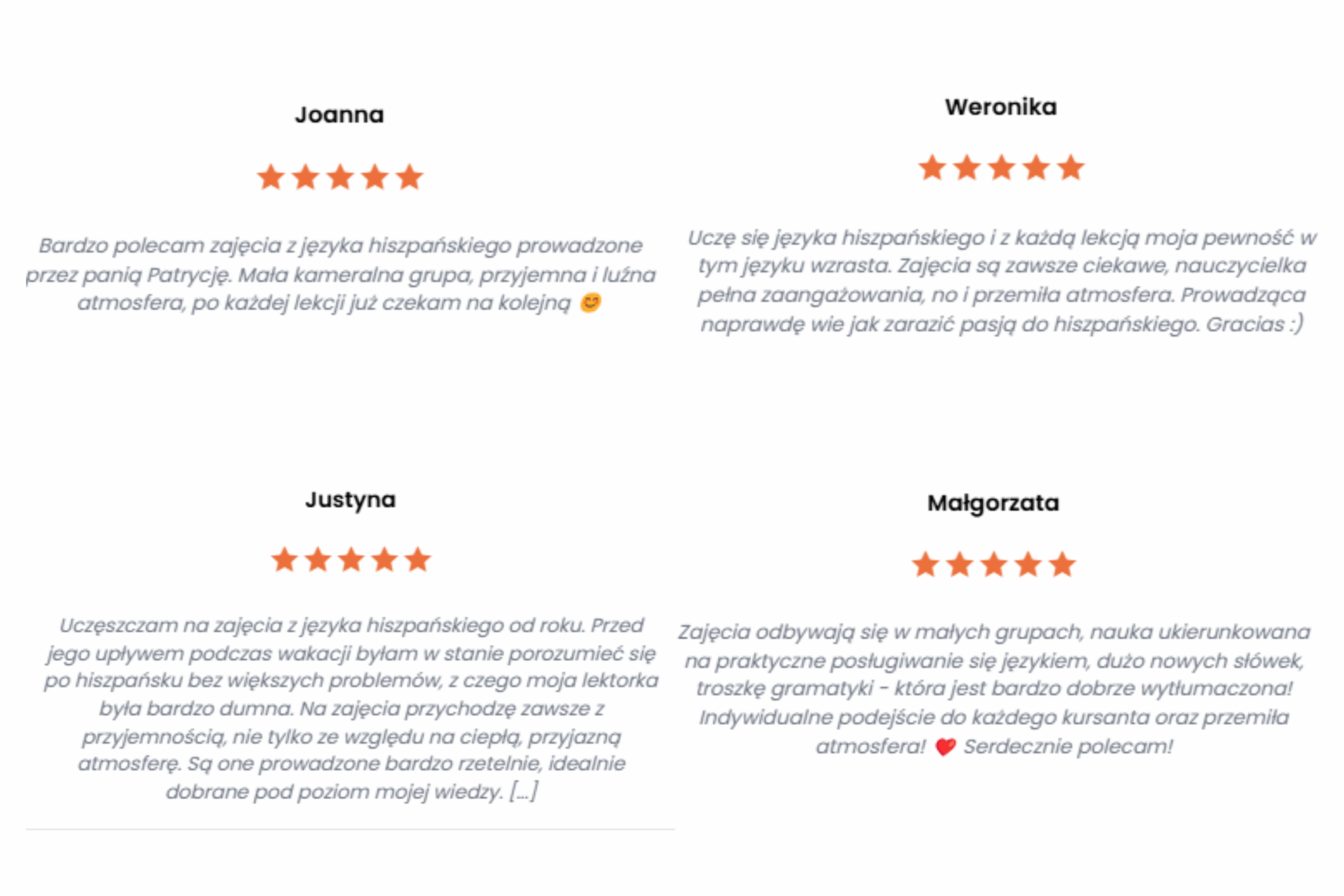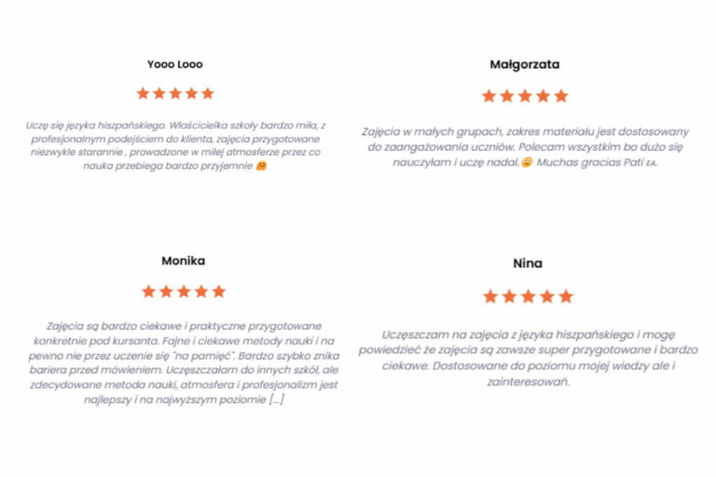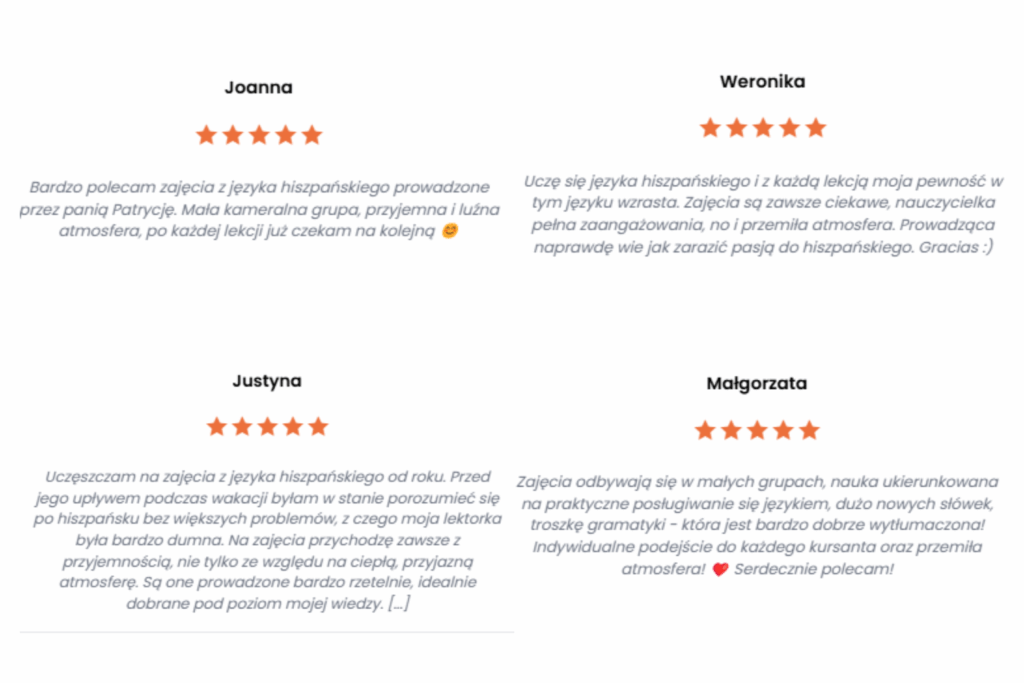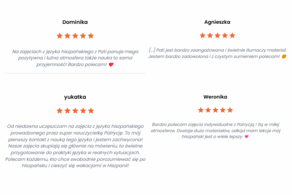 Cześć! Nazywam się Patrycja i od 8 lat uczę hiszpańskiego, a od 5 prowadzę własną szkołę językową online i stacjonarnie. Ukończyłam filologię hiszpańską na Uniwersytecie Jagiellońskim ze specjalizacją nauczycielską, a w pracy stawiam na praktyczne podejście komunikacyjne.